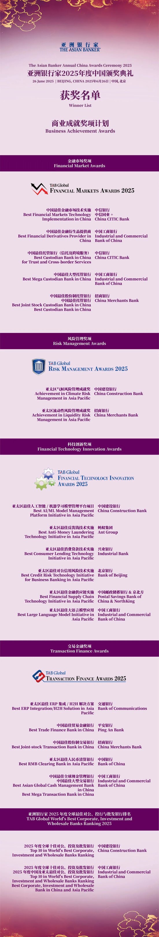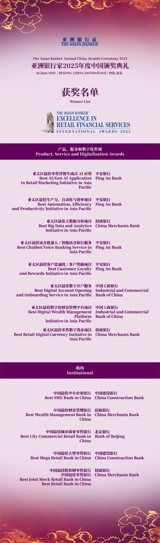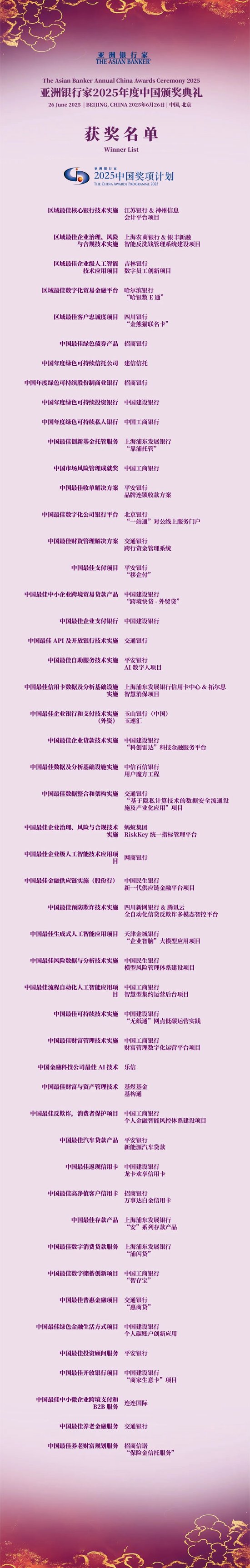 6月26日晚,由亚洲银行家举办的2025年度中国颁奖典礼在北京隆重举行,当晚共颁发中国奖项计划、国际商业成就奖项计划和全球卓越零售金融服务奖项计划三大类奖项。获奖机构包括商业银行、保险、金融科技、科技公司等。